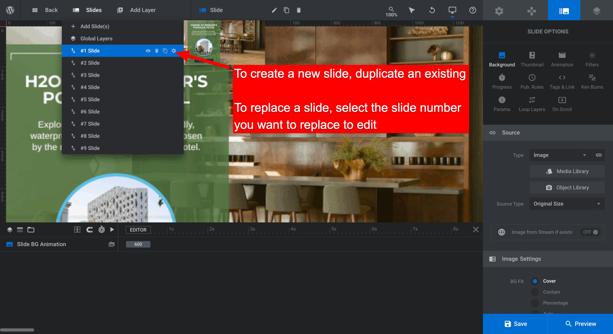 - Slides > To create a new slide, duplicate an existing one. To replace a slide, select the slide number you want to replace & edit.