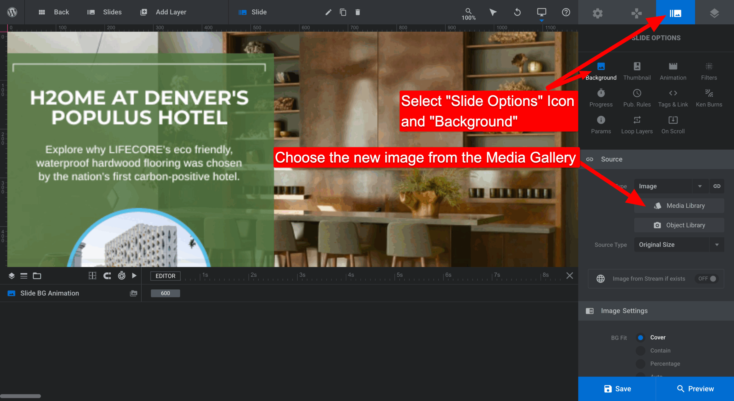 - Select “Slide Options” Icon > “Background”