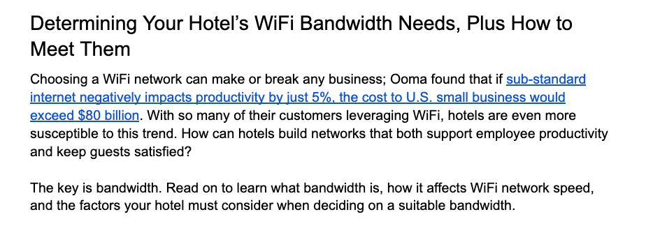 Outbound linking usually requires a slightly higher level of effort; look for areas where a notable statistic can support whatever argument a section of your blog is making. Introductions are typically a great place to do this. Let’s look at a potential intro for “What is Hotel WiFi Bandwidth? How Much Your Hotel Needs”: